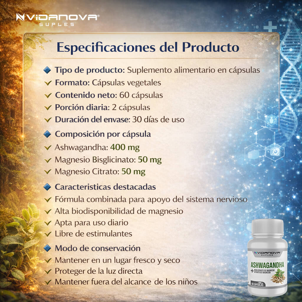 El suplemento ancestral Vidanova® combina el poder de la raíz Ashwagandha y el Magnesio actuando rapidamente en tu cuerpo, reduciendo el estrés y la ansiedad para rendir mejor de día y descansar realmente de noche.